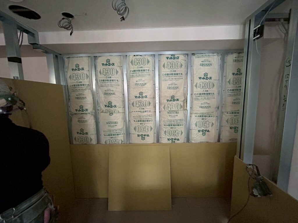 次は建具の枠をつけプラスターボードを貼っていきますが、その前にLGSの間に吸音材などを敷き詰めていきます。