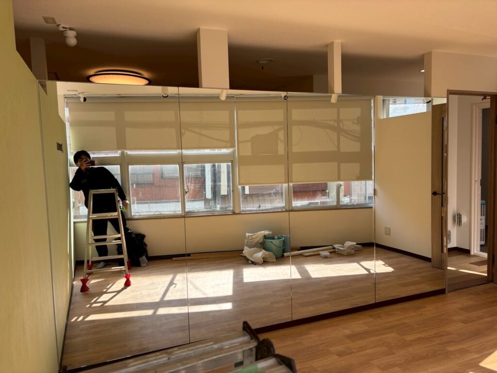 ダンススペースに欠かせないミラーも取り付けられました。床はTOLIのアリーナフィットという屋内スポーツ施設に対応した衝撃吸収性ビニル床シートが貼られました。