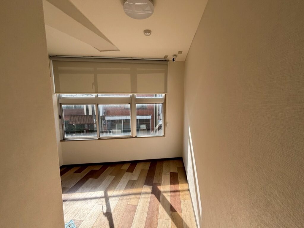 ビス留めとパテ処理を行い、クロスや床材を貼っていきます。床材は3種の色合いを組み合わせており、ポップで明るい雰囲気でレッスンできる様子が感じられますね。