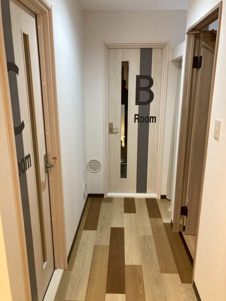 それぞれの部屋に続く廊下とドアはこのようなデザイン。だんだんと完成がみえてきましたね!