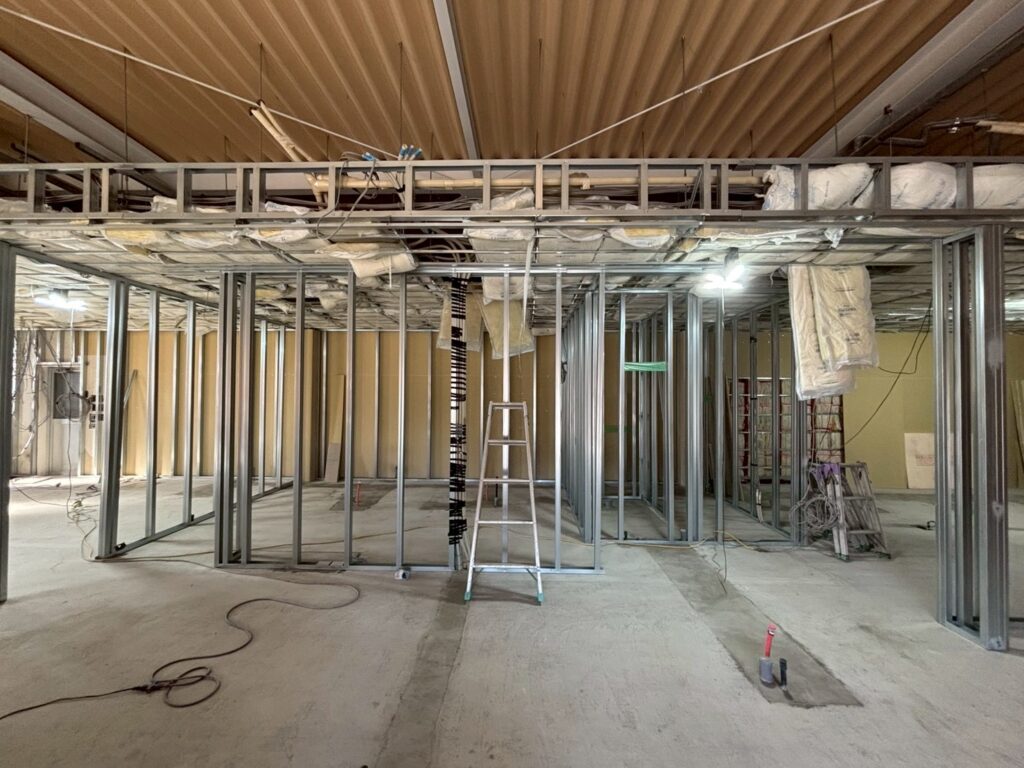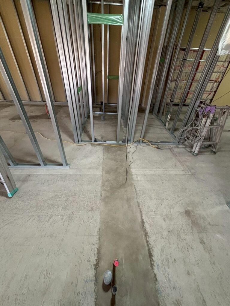 給排水管を仕込んだ部分にコンクリートを打設し、プランの通りに軽量鉄骨(LGS)を立てて間取りがわかるようになってきました!