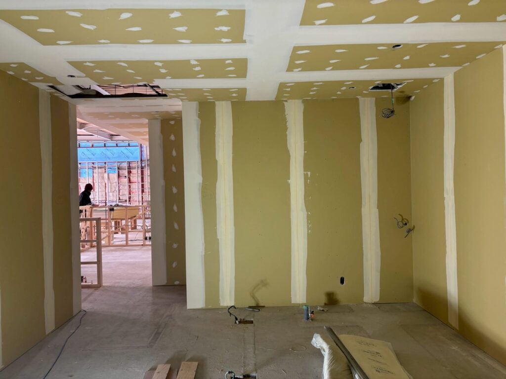 そしてビス留めしたところやボードの継ぎ目にパテを塗り、研磨して凹凸のない壁の下地を作っていきます。