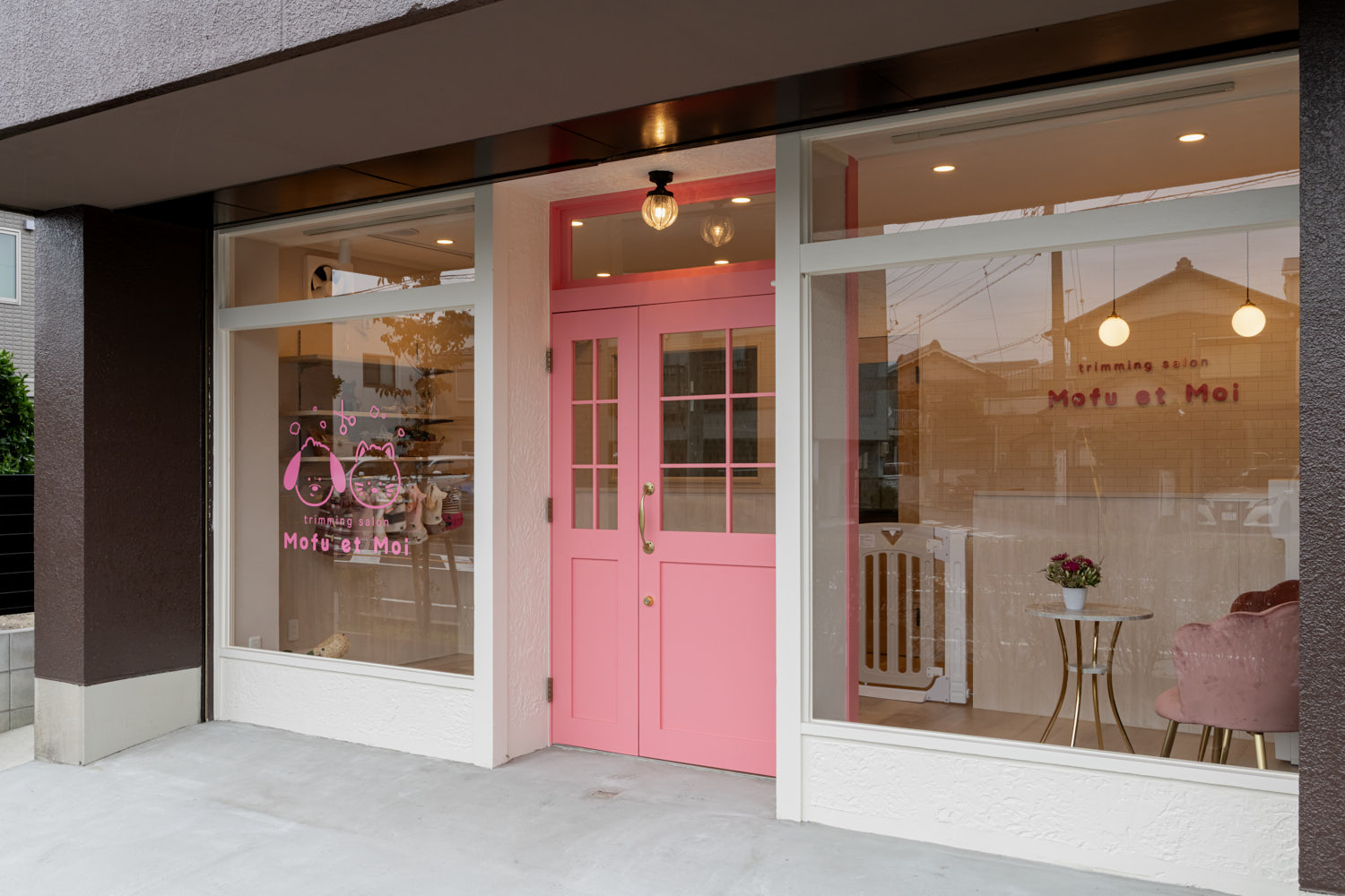 また、赤みのある木板張りのカウンターとパーティションを造作し、お店のアクセントに。ミラーフレームや窓、ドアの建具枠、フォトフレームは黒で統一することで、全体をすっきりとした印象にまとめています。