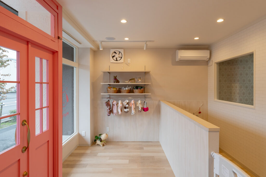 店内は、ホワイト×ベージュを基調に扉やサインにピーチピンクを採用。明るさと温かみのある印象に仕上がっています。