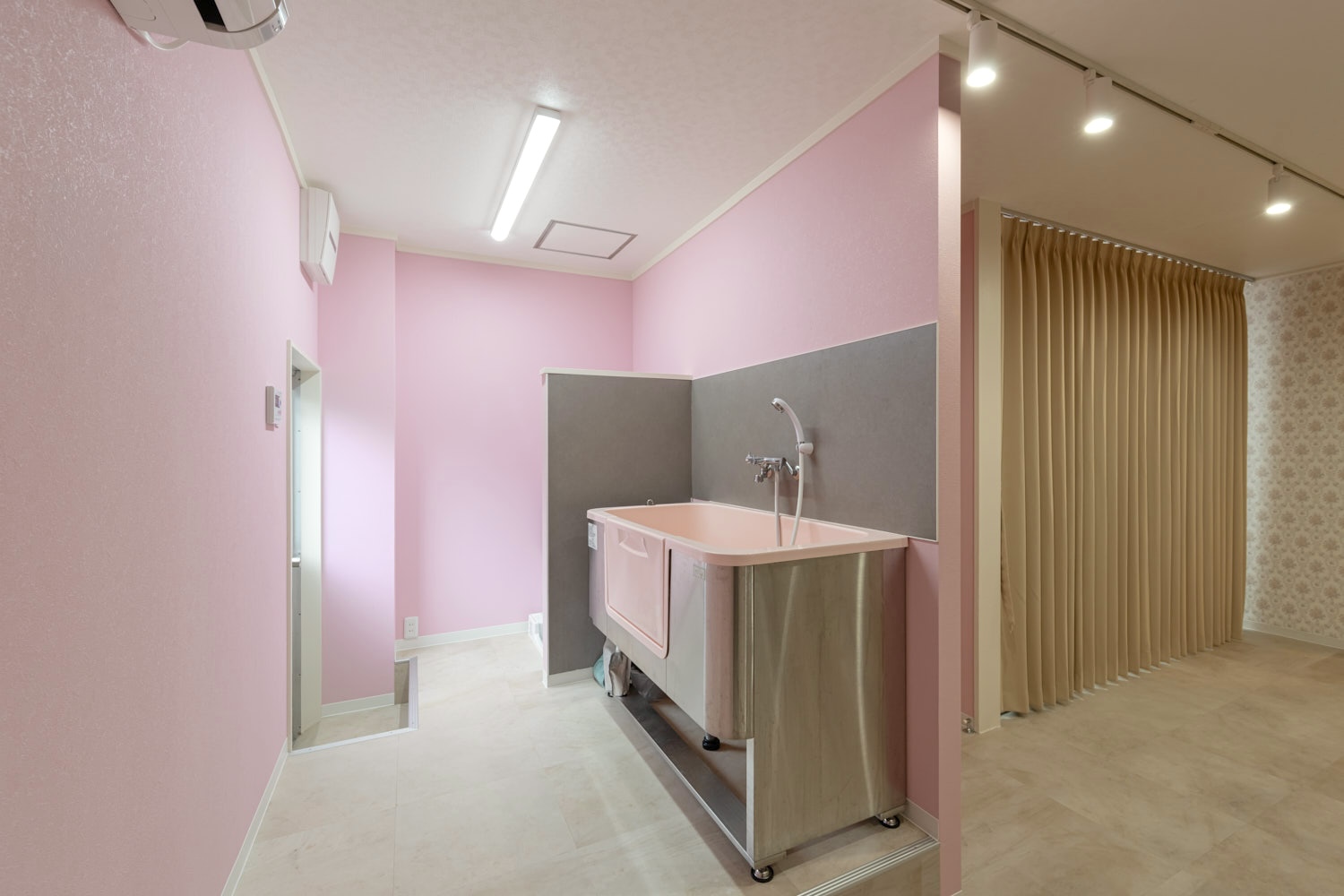 壁の色はドッグバスの浴槽色に合わせた薄いピンク。比較的少ない面積に使用しているので可愛さはそのままに清潔感をキープしています。